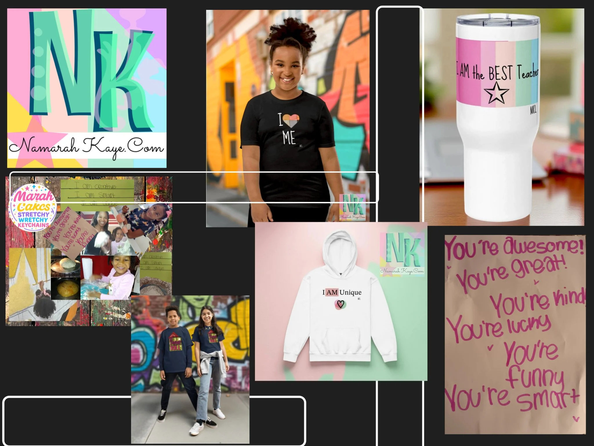 www.namarahkaye.com please go see her site asap and make a purchase. Born in Memphis, this old soul has vision and such an entrepreneurial spirit. This is my first 10 year old business client. I can go on and on about her, but I’ll keep it short. Her affirmation designs on the website merch are an extension of her daily life. Her mom reports that on school mornings, she writes inspiring affirmations for her fellow students, passing them out when she arrives, insisting that they have a good day. Check out her “I AM” line.